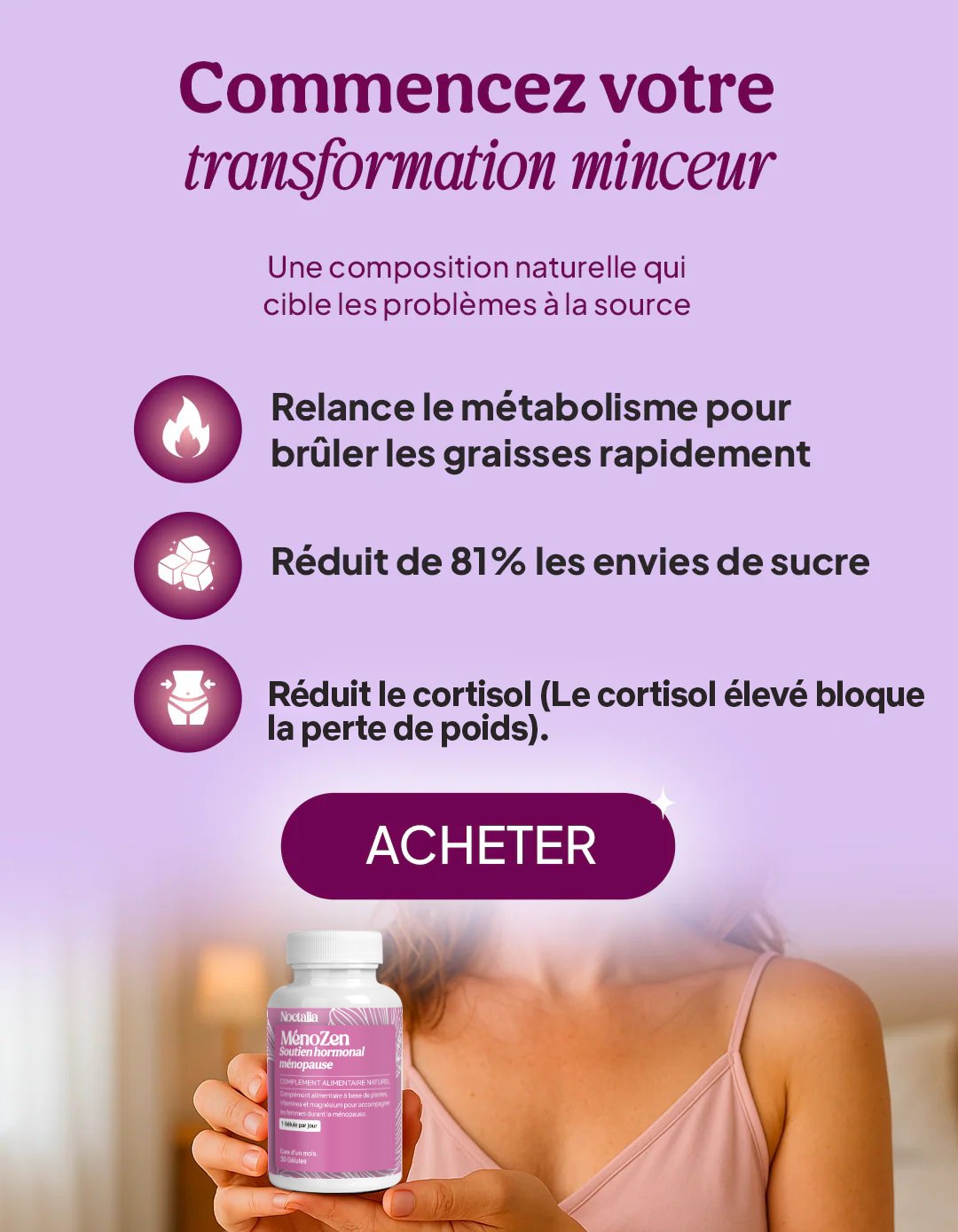 Chaque ingrédient est soutenu par des décennies de recherche, des milliers d’études, et a été dosé avec précision selon les données scientifiques pour aider à éliminer la graisse résistante… et combattre les symptômes hormonaux.