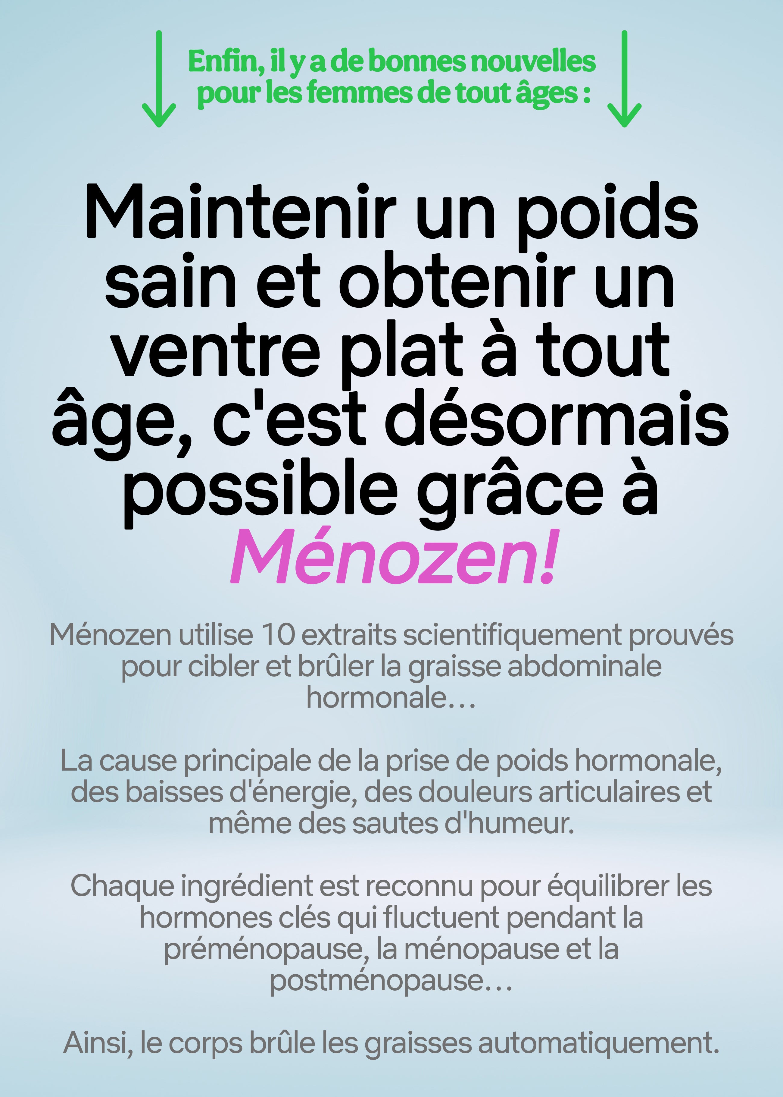 «Je rencontre de nombreuses femmes qui se sentent démunies face à la prise de poids liée à la ménopause. Je recommande souvent Ménozen, car c’est une alternative naturelle, sans hormones, qui aide mes patientes à rééquilibrer leurs hormones, à réduire le stockage des graisses et à retrouver une silhouette dans laquelle elles se sentent bien. »